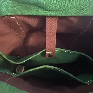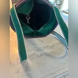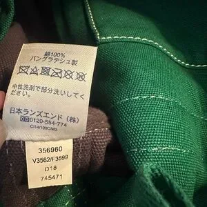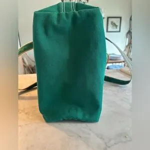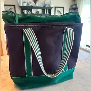 Classic Lands' End medium canvas tote made of SUPERIOR fabric, IMO, compared to the newest fabric. Deep navy body with green base. Striped shoulder straps for easy carrying. Front slip pocket for quick access. Top zipper with key clip inside. Four pockets total.