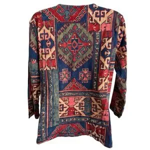 Add a bold, vintage-inspired vibe to your wardrobe with this Lauren Jeans Co Ralph Lauren Southwestern print top. Featuring a striking Aztec pattern in rich reds, blues, and earthy tones, this piece delivers that perfect boho / western aesthetic that's trending right now.