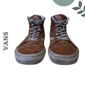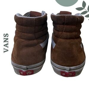 Classic Vans with a cold-weather upgrade. These Vans Sk8-Hi Scotchgard boots feature rich brown suede with Vans’ Scotchgard™ weather-resistant treatment, making them tougher and more practical than standard Sk8-Hi sneakers. High-top design with padded collar for ankle support, signature side stripe, and durable waffle sole. Perfect for fall, spring, and dry winter days — casual, skate-inspired, and easy to style. ⸻ 📏 Size & Fit • Women’s US 9.5 • Men’s US 8 (tagged) • EU 40.5 • CM 26.0 👉 True Vans fit ⸻ 🧵 Details • Brand: Vans • Style: Sk8-Hi • Material: Suede (Scotchgard™ treated) • Color: Brown / Tan with white stripe • Closure: Lace-up • Sole: Classic Vans waffle outsole • Lined & padded ankle collar ⸻ 🔎 Condition Good pre-owned condition • Normal wear to suede and midsoles (see photos) • Soles show use but still plenty of life • Structurally solid, no separation ⸻ 💡 Why You’ll Love Them ✔ Weather-resistant Scotchgard suede ✔ High-top ankle support ✔ Everyday casual + street style ✔ Discontinued / harder-to-find variation