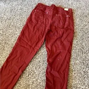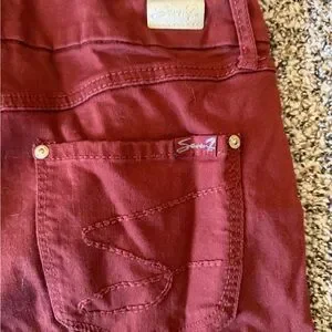 Seven7 skinny jeans. Deep red color throughout. Classic five-pocket styling. Zip and button closure. Stretchy, comfortable fabric.