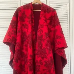 Bold red wrap cape with an allover black floral print. Open front, draped silhouette. Elegant and statement-making piece.