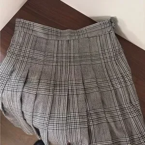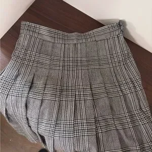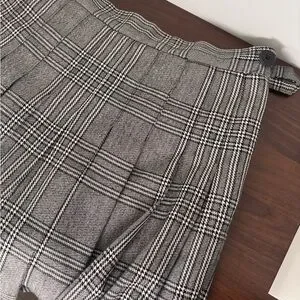 Classic pleated mini skirt in a gray plaid pattern. Soft woven fabric with clean pleats for a flattering silhouette. Versatile piece that pairs easily with sweaters, blouses, or jackets. Identified color: gray.