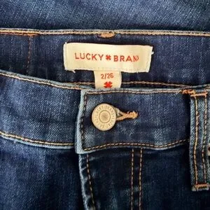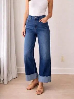These are an awesome in like new (worn once) condition Lucky Brand Wide Leg High Rise Jeans Cuffed Raw Hem Medium Wash Denim Size 2- 26. Denim has stretch.
