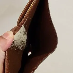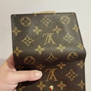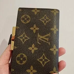 Compact Louis Vuitton card and key holder with classic monogram canvas. Snap closure and stitched edges. Multiple slots for cards and notes. Iconic LV pattern for timeless luxury.