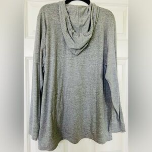 Comfortable heather gray pullover tunic with hood and drawstring. Soft knit fabric for easy wear. Front kangaroo pocket for small items. Subtle logo detail near pocket. Classic casual style for everyday use. Excellent pre owned condition.