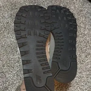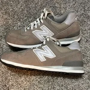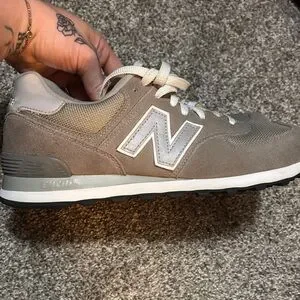 Classic New Balance lace-up sneakers. Suede and mesh upper for breathability. Cushioned midsole for comfort. Iconic 'N' logo on sides. Neutral taupe tone pairs easily with casual wear. The original grey color 574. Men’s 8.5 but I’m a women’s 10 ! So they can be either