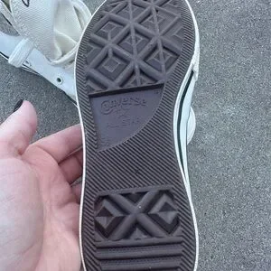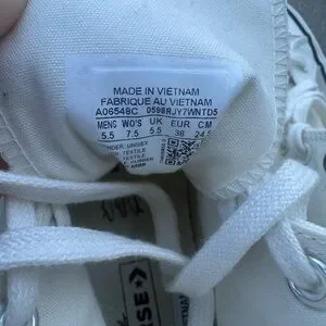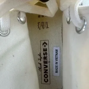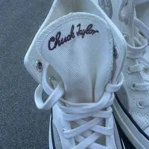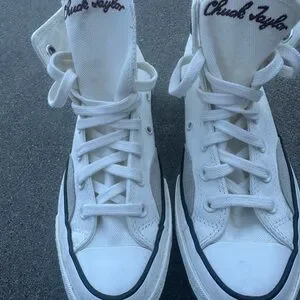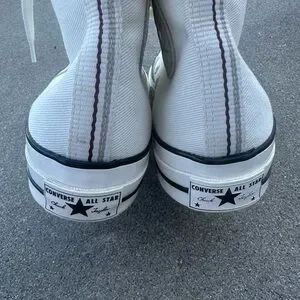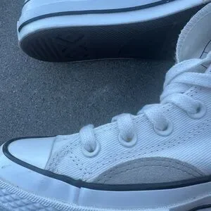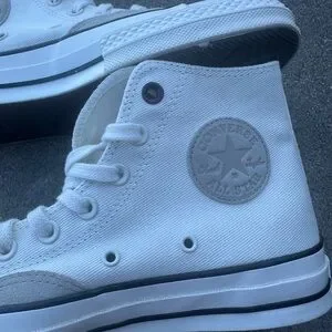Classic Converse high-top silhouette. White canvas upper with tonal star patch. Black foxing stripe and outsole trim. Lace-up design with metal eyelets. Timeless casual style.