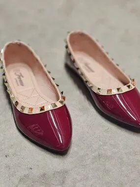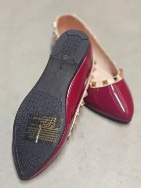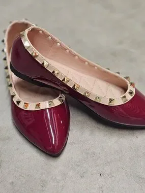 These studded burgundy flats offer a polished look with patent leather shine, gold-tone accents, and a comfortable quilted insole. Ideal for work or casual settings.
