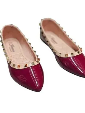 Studded Burgundy Patent Leather Flats With Pointed Toe & Quilted Insole