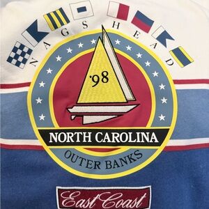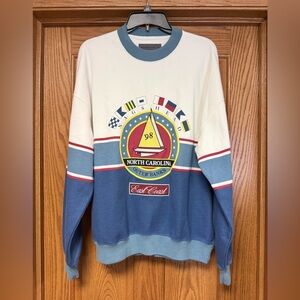 Comfortable cream and blue crewneck sweater with nautical patch detailing. Soft knit fabric with ribbed collar and cuffs for a relaxed fit. Versatile style that pairs well with casual outfits. Features colorful emblem and sleeve insignia for a maritime look.