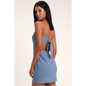The Lulus Send a Postcard Blue Chambray Tie-Back Mini Dress is perfectly picture-worthy, so you can wear it everywhere! Breezy woven chambray shapes a cute apron neckline and a darted bodice with a tying, open back, all supported by adjustable skinny stra
