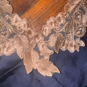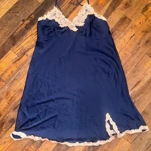 Elegant navy satin chemise with contrasting cream lace trim. Soft, lightweight fabric for comfortable sleep and lounge. Adjustable spaghetti straps for a personalized fit. Feminine V-neckline with delicate lace detail.