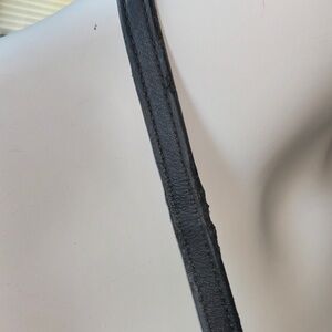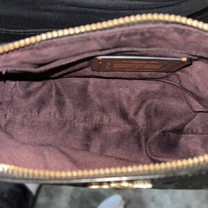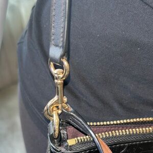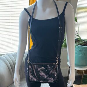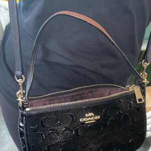 Sleek Coach crossbody with embossed signature pattern. Shiny gold-tone hardware and zipper. Adjustable leather strap for shoulder or crossbody wear. Compact and versatile for day-to-night looks.