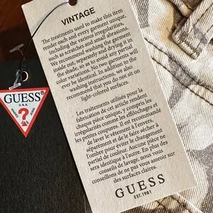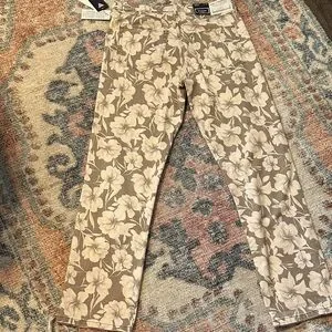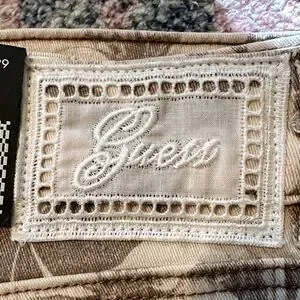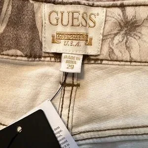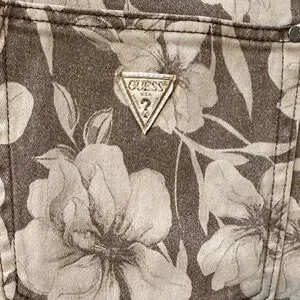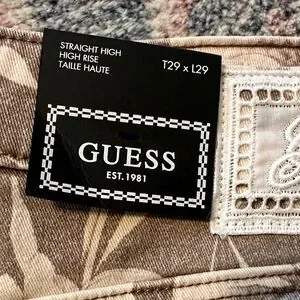 GUESS jeans with all-over floral print. Taupe base with cream flowers. Straight-leg silhouette. Branded back-pocket triangle logo. ~15” waist, ~29” inseam. ~11.5” rise. The sales tag lists this style as a tall. I am 5’1” and the fit was too long for me.
