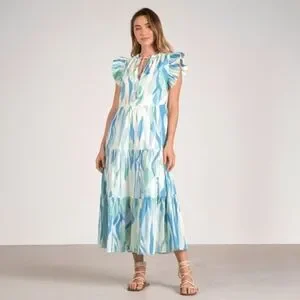 Tiered maxi dress with flutter sleeves. Keyhole tie neckline. Airy fabric and flowing silhouette. Soft blue and green abstract waves print.