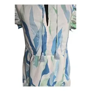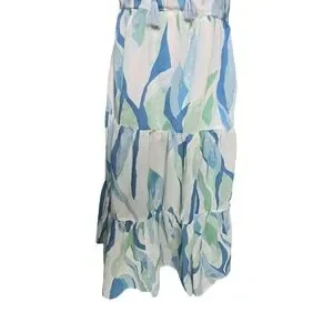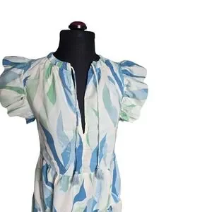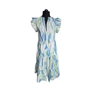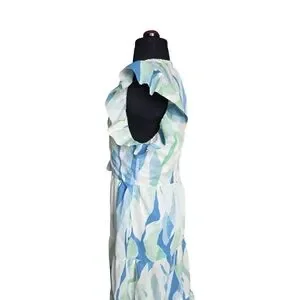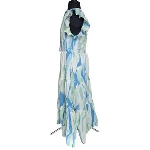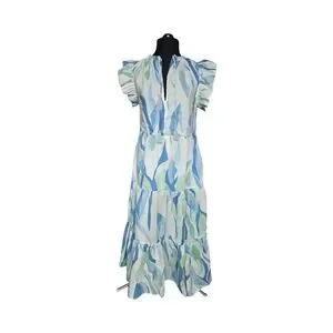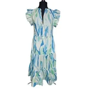 Blue & Green Flutter Sleeve Maxi Dress 100% Cotton Size S Coastal Cottagecore