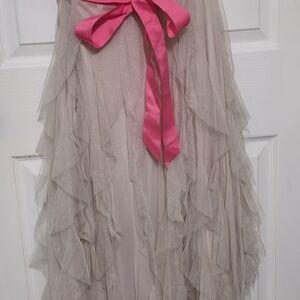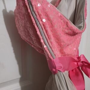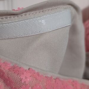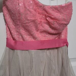Strapless prom dress with a sequined pink bodice. Pink satin waist band highlights the silhouette. Layered cream tulle skirt for soft volume. Great for dances and formal events. Has only been worn once for a couple of hours.