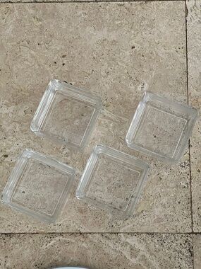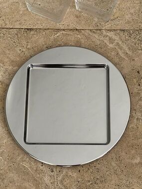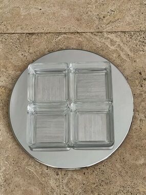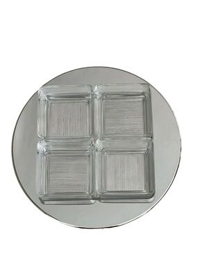 Divided server with four square compartments. 4 thick glass squares lift off chrome tray portion. Each glass square has a nice textured fine line detail embossed on the under side of the square. Chrome is not scratched ; this item was never used, but was stored for a long time. Original box which is gently worn. Simple, modern styling showcases foods. Pairs well with mirrored or metallic serving pieces. Great for appetizers, snacks, and condiments. One owner, my mom. STUDIONOVA Japan. Box weighs 4.7 pounds.