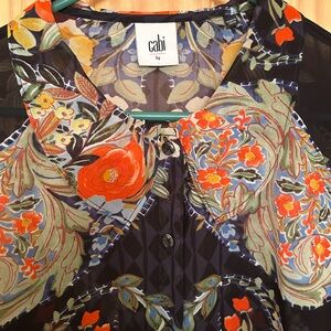 CAbi Black Blouse with Orange & Yellow Floral Print