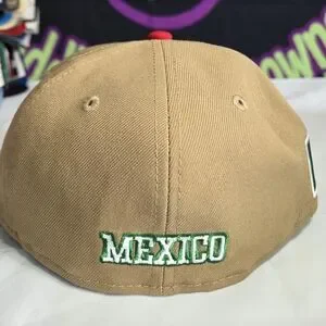 Two Tone camel on red features red, white, & green Team Mexico 'M'. Mexico flag sp. Mexico script in rear. Gray under, Black guts