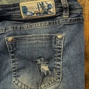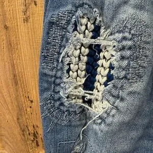 Slim straight silhouette with cool patchwork. Classic five-pocket design and stitched back pocket detail.