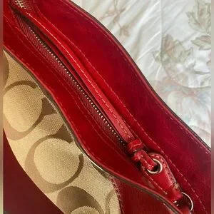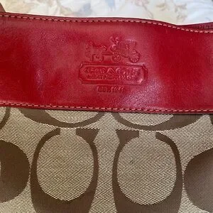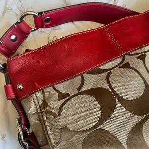 Classic Coach canvas shoulder bag with signature 'C' pattern. Red leather trim and strap accent the top. Silver-tone hardware and zipper details. Comfortable single shoulder strap for everyday wear. Small spot on front canvas and scratch on back leather. Zipper also has small pen mark. See photos.
