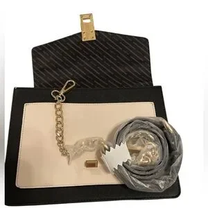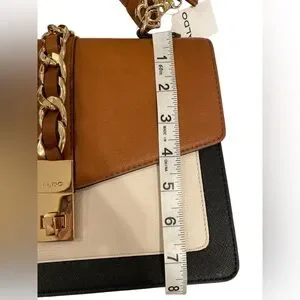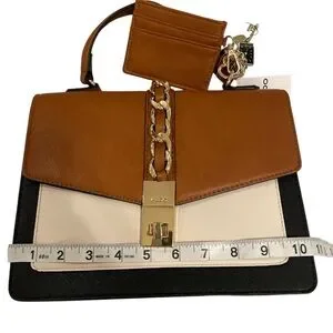 Aldo Caiilla Top Handle Satchel/Crossbody Bag Brown Black and Cream Color Block with Gold tone Hardware. Turn-lock closure. Decorative chain accent with detachable adjustable shoulder strap. Detachable bag charms. Detachable card holder. Interior compartments with a zipper pocket. Exterior back zip pocket. Faux leather and synthetic exterior. See photos for measurements. NWT.