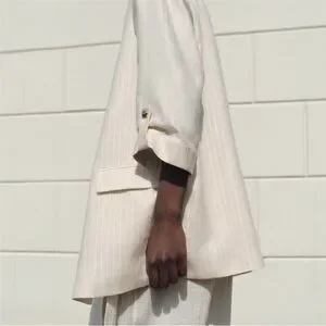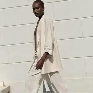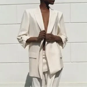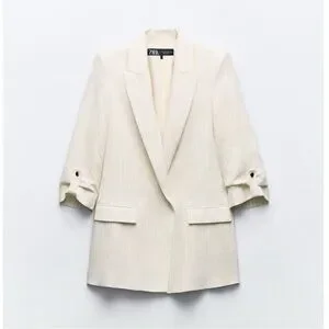 From Zara, a lightweight open front blazer with notch lapel collar, 3/4 length cuffed sleeves with gold-tone button tab, front flap pockets, padded shoulders and a vertical pinstripe design.