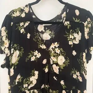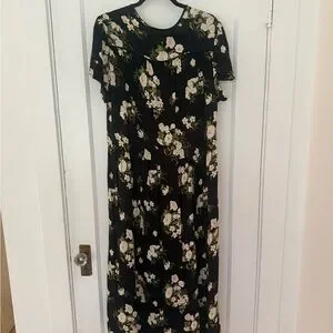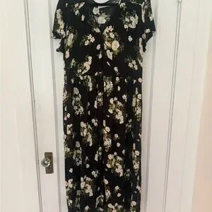 Flowy midi dress with short sleeves. Black base with cream floral print and green foliage. Soft, romantic silhouette. Button-front detail. Easy, feminine wear.