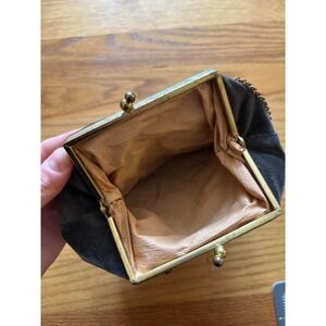 Vintage black velvet evening bag offers a sophisticated touch for formal occasions. This elegant clutch features a soft velvet exterior paired with a structured brass-tone frame and a classic kiss-lock closure. The interior is lined with a contrasting tan fabric, and a delicate gold-tone chain strap allows for versatile carrying as a small handbag or tucked in as a clutch. Perfect for adding a mid-century aesthetic to your evening ensemble.