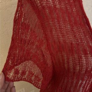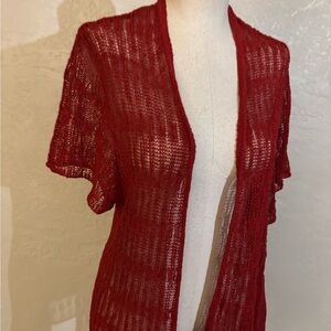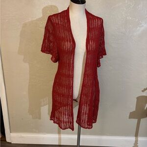 Sheer open-front knit cardigan in a rich red hue. Short sleeves with a relaxed, breezy fit. Lightweight and perfect for layering. Soft, airy texture.