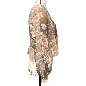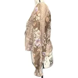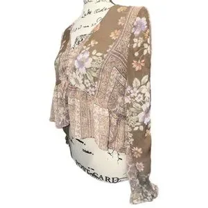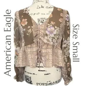 A beautifully detailed American Eagle boho blouse featuring a patchwork-inspired mix of florals, soft geometrics, and earthy tones. This top blends warm browns, lavender, cream, and muted greens into a romantic, free‑spirited aesthetic perfect for year‑round styling. Made from lightweight 100% polyester, it drapes effortlessly with a relaxed fit and subtle semi‑sheer texture. The V‑neckline, gathered front, and peplum-style hem create a flattering silhouette, while the long sleeves add flow and movement. Whether paired with denim, layered under a cardigan, or styled for a festival-ready look, this blouse brings easy charm to any outfit.