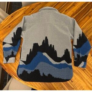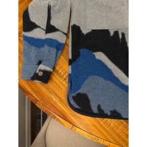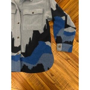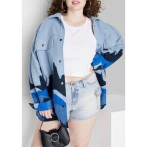 The Wild Fable Blue Desert Southwestern Mountain Shacket Snap Jacket is a stylish and versatile piece perfect for travel, casual outings, or workwear. Made of polyester with a flannel fabric type, this oversized jacket features a snap closure and a landscape pattern in shades of blue. The jacket is adorned with accents like snaps and pockets, and has a collared neckline, long sleeves, and a mid-length design. Ideal for the winter, fall, or spring seasons, this lightweight and chore coat offers both comfort and style, making it a must-have addition to any wardrobe.