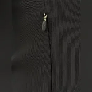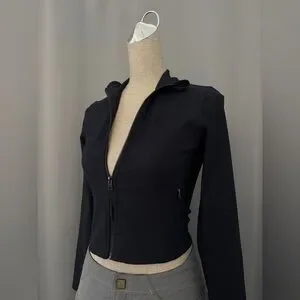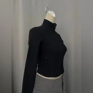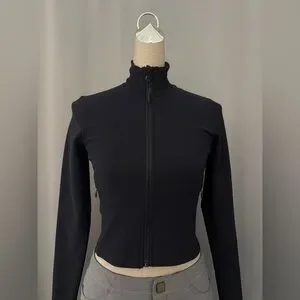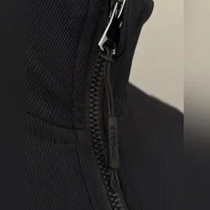 Slim, fitted silhouette with a full front zipper. High stand collar for light coverage. Long sleeves with clean, minimal lines.