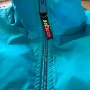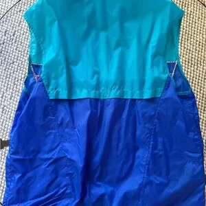 Lightweight sleeveless windbreaker vest. Front zip closure. Colorblock panels for a sporty look. Bright teal, royal blue, and magenta accents. Casual and activewear friendly.