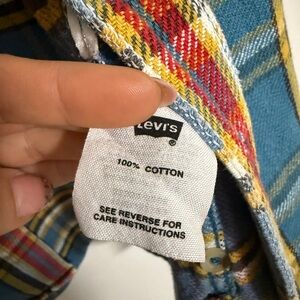 Levi's plaid button-up shirt. Blue base with yellow and red stripe details. Front buttons and visible label. Casual flannel-style look.