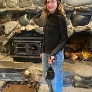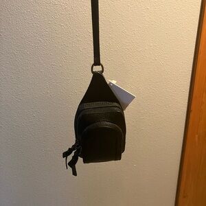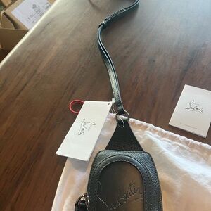 Compact Christian Louboutin leather backpack MINI with embossed signature. Smooth black leather exterior with subtle trim.Sleek, modern accessory for everyday use.NWT AND DUST BAG!