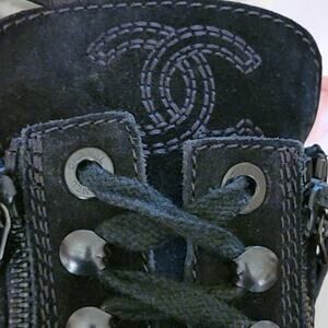 Chanel Combat Boots . Quilted Suede Boots . CC Logo Lace Up . Black Moto Boots . Luxury Utility Style . Designer Street Style . G29324 . Italian Craftsmanship . Quiet Luxury Footwear . Collectible Chanel