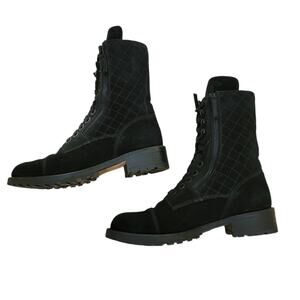 Authentic Chanel G29324 Quilted Combat Boots crafted in Italy from rich black suede with signature quilted side panels. Designed with an interlocking CC at the tongue, lace-up front, and smooth silver-tone hardware, these boots blend Parisian luxury with refined utility. The double side zippers make them effortless to slip on, while the sturdy rubber sole and rounded combat toe offer comfort and durability. Authenticated by a trusted third-party luxury expert prior to listing for buyer confidence and peace of mind.
