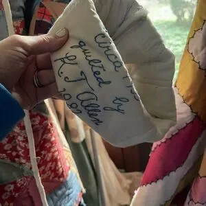 Handmade-style patchwork quilted jacket. Features pink, light blue, cream, tan, and brown fabric panels. Cozy open front with rolled cuffs. Casual boho vibe. Great layered piece.