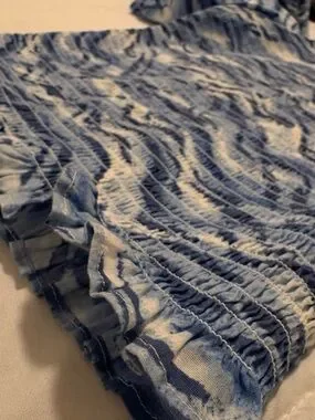 Soft printed top with blue and white zebra-inspired pattern. Features a smocked bodice and voluminous puff sleeve. Lightweight and stylish for casual wear. Easy to pair with jeans or skirts.