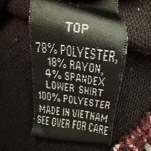 Material: Body- 78% Polyester, 18% Rayon, 4% Spandex. Lower hem- 100% Polyester.