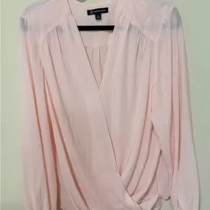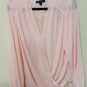 Soft blush pink wrap-front blouse with a flattering surplice neckline. Long sleeves with gentle gathers at the shoulders. Lightweight drape ideal for day or evening wear.