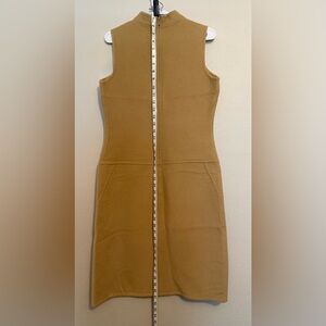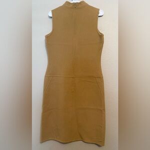 Sleek sleeveless mock neck midi dress by Kenar. Smooth knit fabric with clean seam detailing. Tailored shift silhouette for a refined look. Neutral camel brown ideal for versatile styling. Simple, polished piece for day or evening.