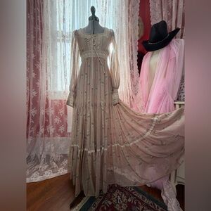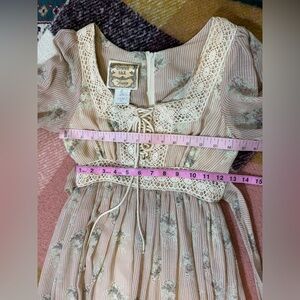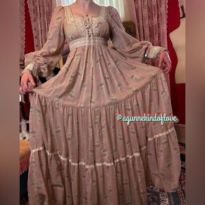 Gunne Sax Maxi Dress in a Striped Dusty Rose Pattern with Crochet Lace Trim. Tagged size 5 but fits closer to a Gunne 7. 32” bust pulled taut. 26” waist pulled taut. 54” length. Big sweep. No flaws to note.