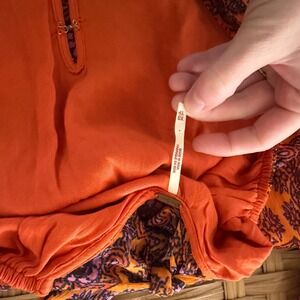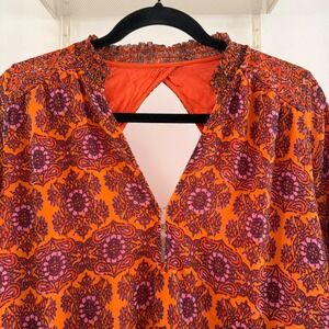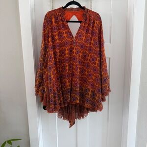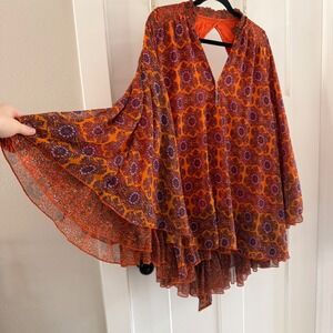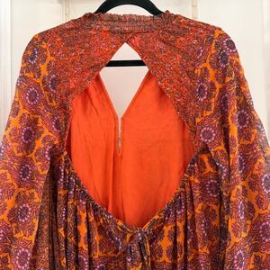Free People Gabi Printed Tunic Top Orange Purple Open Back XS Boho Belle sleeve