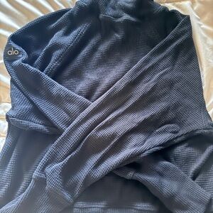 Black Alo activewear top with visible brand tag. Soft-feeling knit fabric. Simple sporty style. Easy to pair with workout looks.