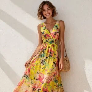 The deep V-neckline adds femininity, while the smocked waist creates shape and comfort, allowing the skirt to flow beautifully with movement. Crafted in a lightweight, airy fabric, this dress is perfect for spring and summer events, vacations, garden parties, weddings, or elevated everyday wear.