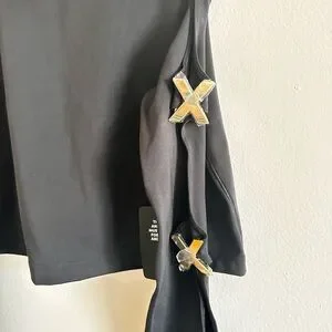 Savage X Fenty black crop top with dramatic open-sleeve cutouts and gold hardware accents. Sleek stretch fabric offers a fitted, comfortable feel. Stylish statement piece that pairs easily with high-waist bottoms.