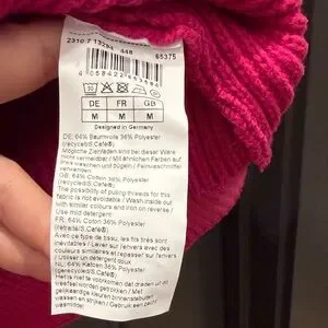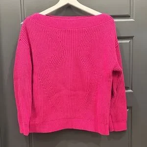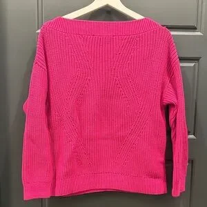 pink knit sweater features a textured stitch pattern and wide high neckline for easy layering. Comfortable long sleeves and ribbed hem for a polished finish. Versatile pink color pairs well with jeans or skirts. Brand is European: Hallhuber Donna. Perfect condition. Length 23 inch, chest 20 inch